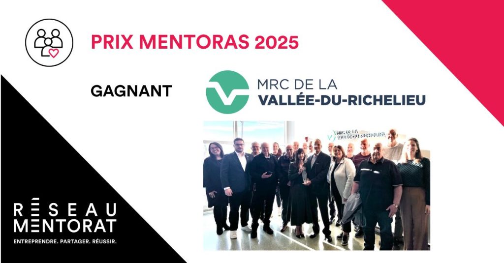 McMasterville, le 3 novembre 2025 – Le 29 octobre dernier, la MRC de La Vallée-du-Richelieu (MRCVR) a eu l’honneur de recevoir le prix MENTORAS 2025, une distinction remise par le Réseau Mentorat à une organisation qui se distingue par sa contribution exceptionnelle à la promotion et au développement du mentorat entrepreneurial dans sa région.