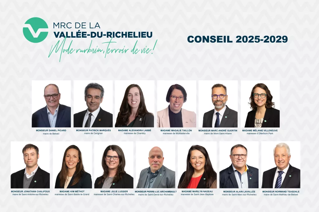 McMasterville, le 7 novembre 2025 – La MRC de la Vallée-du-Richelieu (MRCVR) est heureuse d’annoncer la composition de son nouveau Conseil des élu(e)s à la suite des récentes élections municipales.