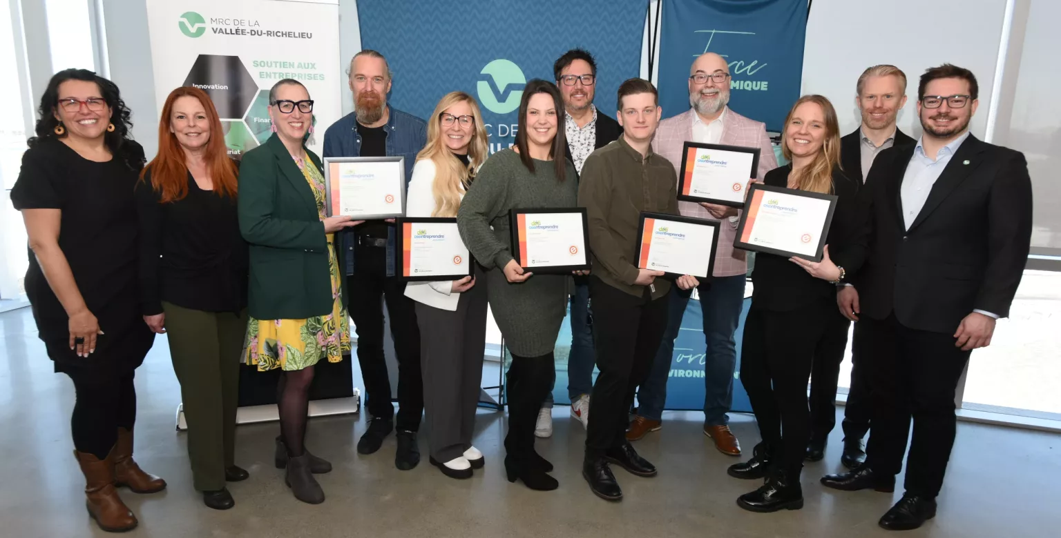 Sur la photo de gauche à droite : Marilyn Nadeau (préfète MRCVR et mairesse de Saint-Jean-Baptiste), Francine Guay (Conseillère Ville de Chambly), Alexandra Labbé (Mairesse Ville de Chambly), Marco Bérubé (Alté), Sabrina Pelletier (Robe et Rebelle), Laurianne Forget (Créa Évènement), Jean-François Roch (Référence TI), Coup de coeur du jury – Yannis Delmatti (Le Maillon Fort), Stéphane Sylvestre (Référence TI), Francheska Chouinard (Solutions ECS), Baptiste Lang et Marc-Antoine Côté (MRCVR). Crédit photo : Patrick Deslandes