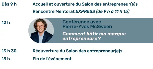 La journée se conclura avec la conférence de Pierre-Yves McSween, « Comment bâtir ma marque entrepreneure? », pour repartir inspiré(e) et outillé(e) afin de faire rayonner son entreprise.