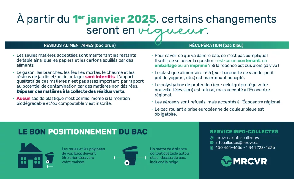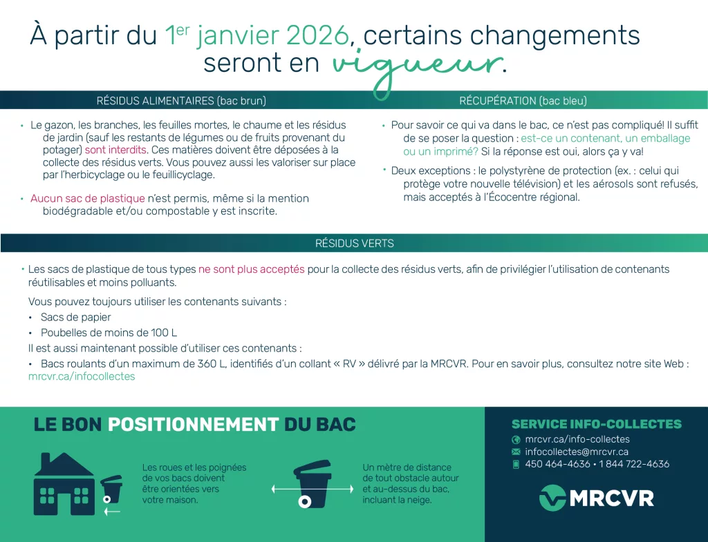 Toutes les précisions sur la page Ordures ou en communiquant avec le service Info-collectes de la MRC de La Vallée-du-Richelieu, par téléphone au 450 464-INFO (4636) ou sans frais 1 844 722-INFO (4636).