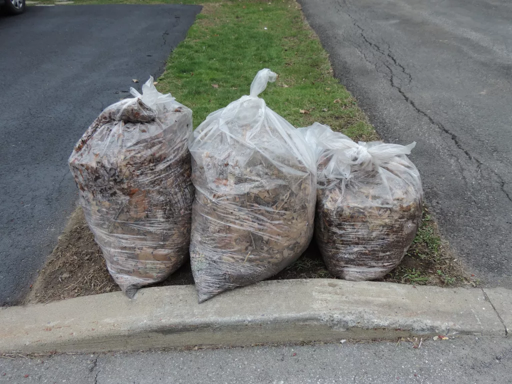 - des sacs de plastique transparent ou orange biodégradables (les sacs verts ou noirs ne sont pas acceptés), ou;
